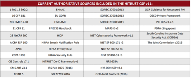 The HITRUST CSF includes a wide array of standards, frameworks, and regulations; it maps to about 40 authoritative sources: